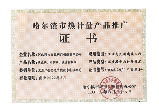 自力式流量控制閥-哈爾濱市熱計(jì)量產(chǎn)品推廣證書-