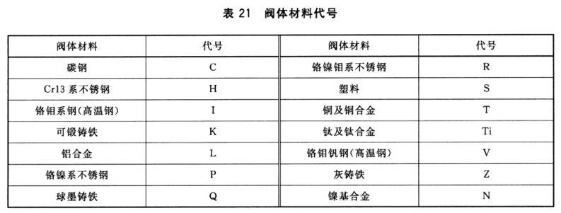 閥體材料代號一般按表21的規(guī)定。當閥體材料標注具體牌號時,可以寫明牌號,如A105、CF8、316L. ZG20CrMoV等。