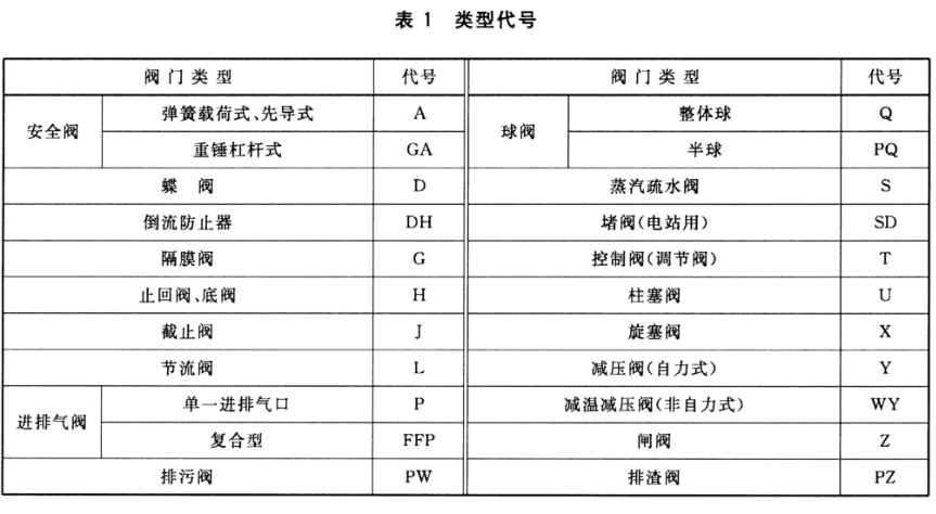 閥門典型類型代號用漢語拼音字母表示,按表1的規(guī)定。