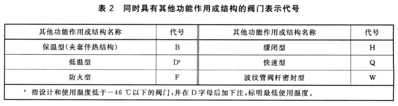當閥門又同時具有其他功能作用或帶有其他結構時,在閥門類型代號前再加注一個漢語拼音字母,典型功能代號按表2的規(guī)定。