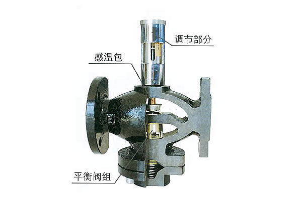 當(dāng)管路中回水溫度高于設(shè)定溫度,感溫包膨脹推動(dòng)閥塞自動(dòng)關(guān)小,減少循環(huán)水流量,使熱媒充分散熱,溫度降低后流經(jīng)閥門。 當(dāng)回水溫度低于設(shè)定溫度,感溫包縮小開大閥塞加循環(huán)水量,使回水溫度達(dá)到設(shè)定的溫度。 2.自動(dòng)平衡部分,用來維持溫度不變時(shí)的流量恒定,消除外網(wǎng)壓力波動(dòng)時(shí)相互干擾。