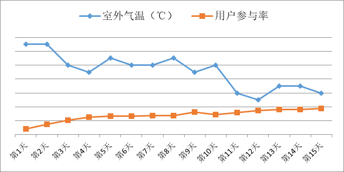 彈性供熱期間選擇使用彈性供熱的居民用戶累計為43438戶(占彈性供熱小區(qū)總戶數(shù)的81.5%),供熱面積508.51萬㎡,經(jīng)自主關(guān)閉閥門未使用彈性供熱的居民用戶為9858戶,供熱面積96.82萬㎡。根據(jù)計量平臺數(shù)據(jù)顯示,在熱源補給充足的情況下,用戶每日根據(jù)需求進行自主調(diào)節(jié)用熱,隨著室外溫度的下降,參與“彈性供熱”的用熱戶數(shù)在逐漸增加,且同一天內(nèi)夜間用熱用戶數(shù)量要遠大于白天用熱用戶數(shù)量,用戶根據(jù)室外氣溫變化參與彈性供熱情況如圖2所示。
