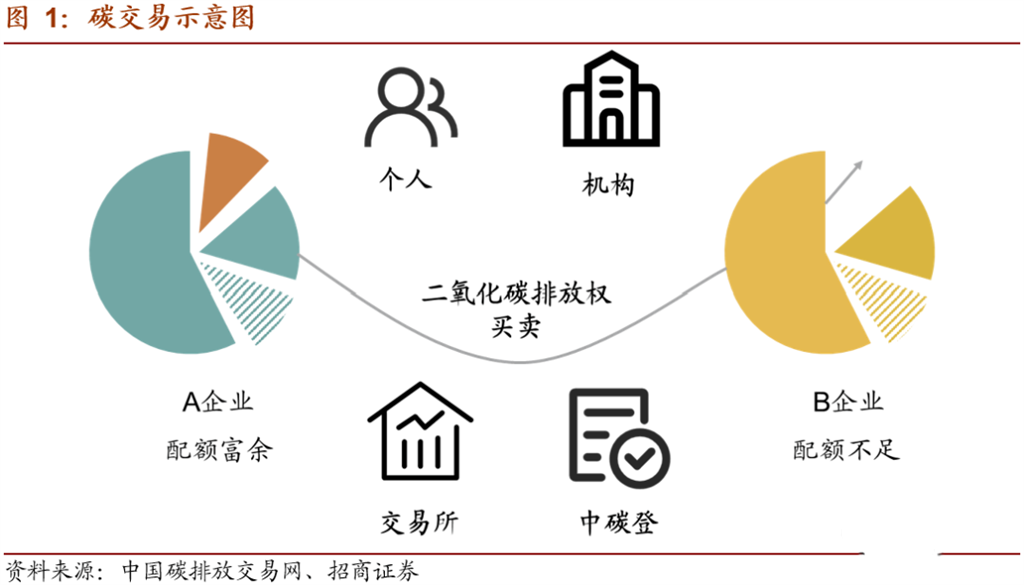 碳交易市場是由政府通過對能耗企業(yè)的控制排放而人為制造的市場。通常情況下,政府確定一個碳排放總額,并根據(jù)一定規(guī)則將碳排放配額分配至企業(yè)。如果未來企業(yè)排放高于配額,需要到市場上購買配額。與此同時,部分企業(yè)通過采用節(jié)能減排技術(shù),碳排放低于其獲得的配額,則可以通過碳交易市場出售多余配額。雙方一般通過碳排放交易所進行交易。